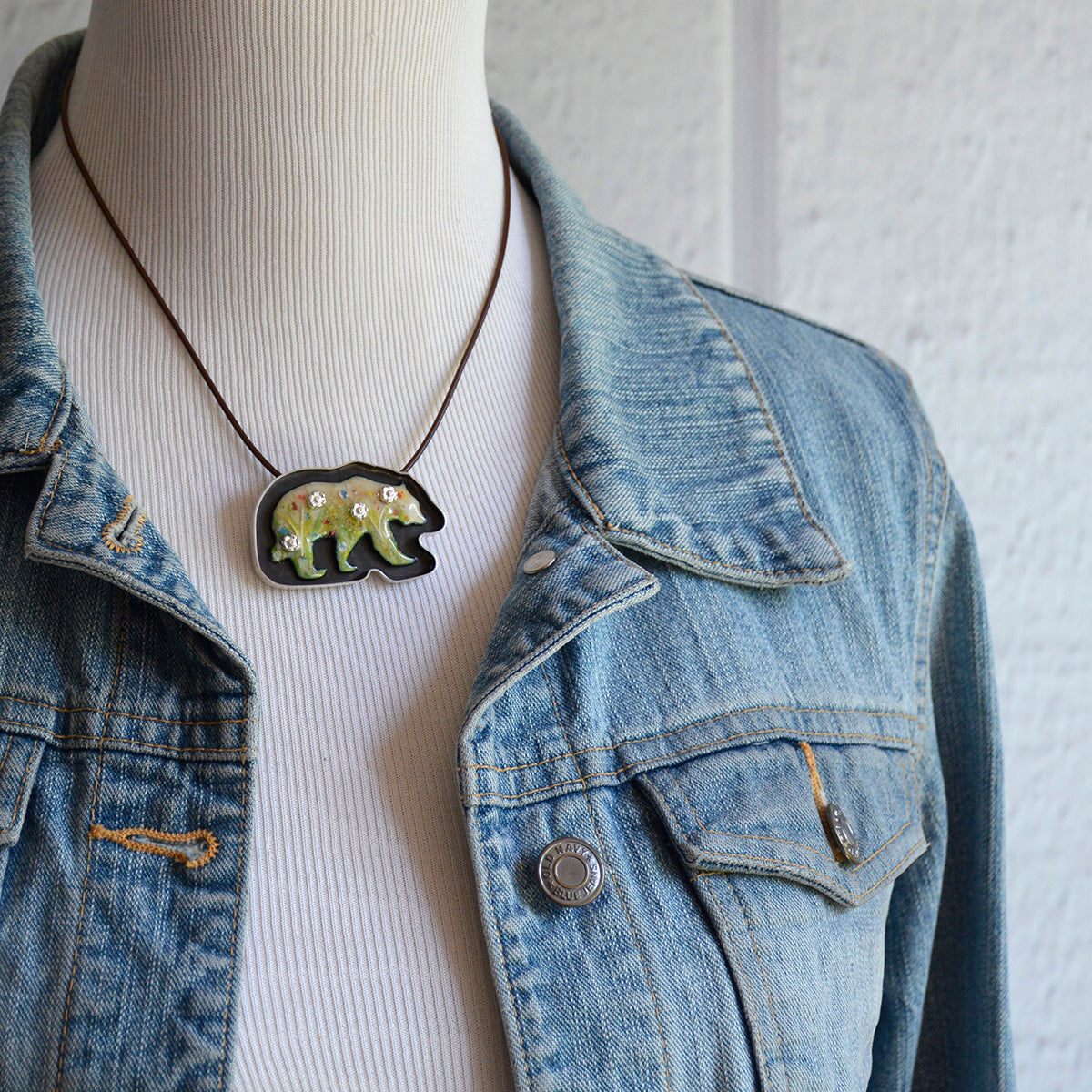 - The bear is hand sawn, then fourteen layers of glass enamel and fine silver wires are fused onto copper in a kiln.
