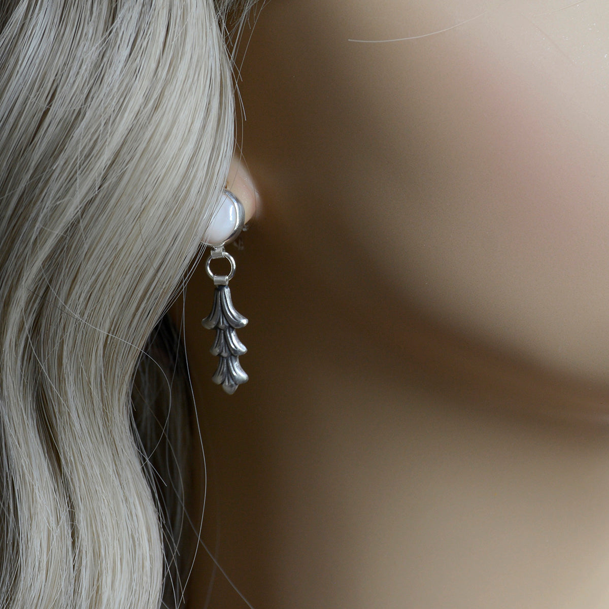 Luminescent Tenessee Mussel shell from vintage stock shimmers above die-struck floral drops made with with molds fashioned from antique tooling.