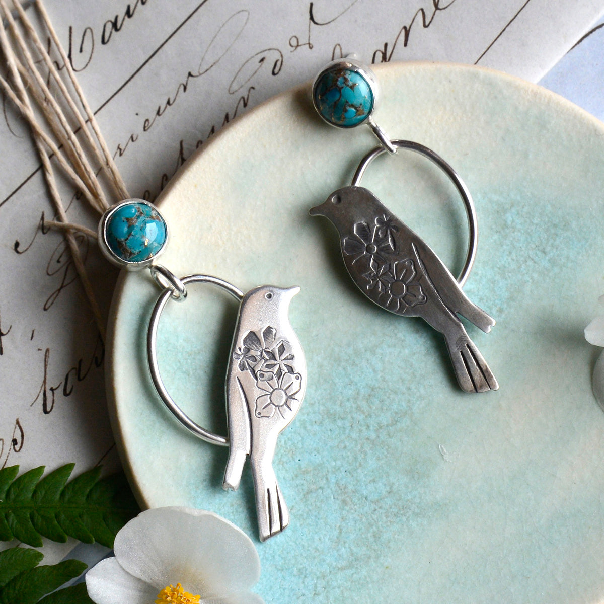 Beautiful turquoise with copper rests above these sweet birds featuring a hand stamped garden and dragonfly.