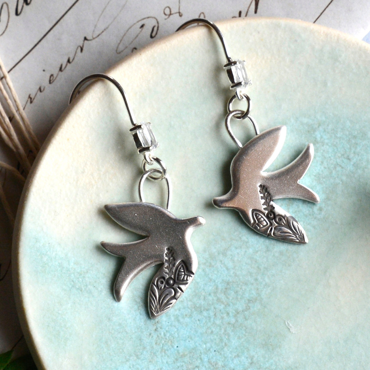 Sweet hand-stamped swallows fly beneath faceted white topaz. Elegance in flight!