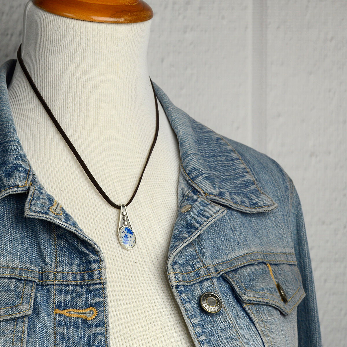Sweet fern leaves in layered shades of blue dance in sterling silver pods. Inspired by antique Delft pottery and vintage blue embroidery swatches, these pieces are one of a kind heirlooms.
