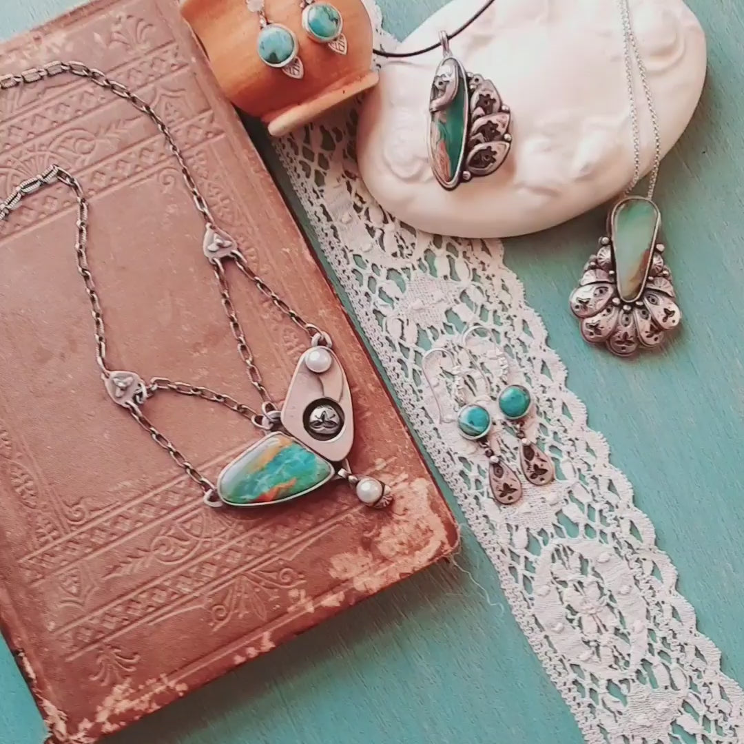 The heart within is a mysterious thing. Will we choose to let it lead us? The Faith Collection features tiny hand cut imagery to inspire you. Rare blue Peruvian opals from old stock mined in the Andes Mountains are accented with shimmering pearls and moonstones. We live by faith, not by sight!