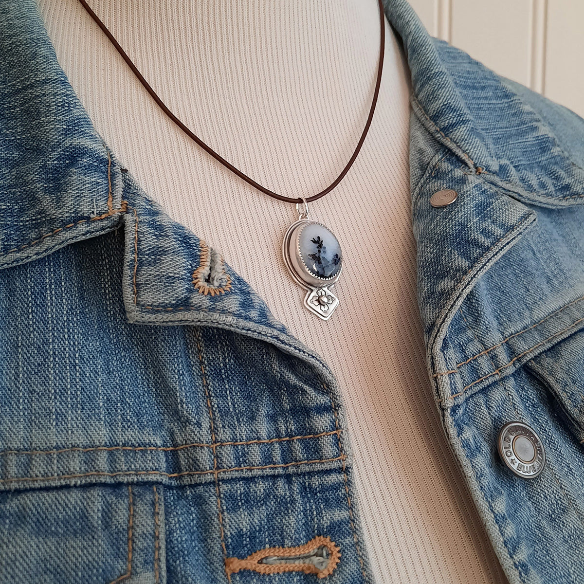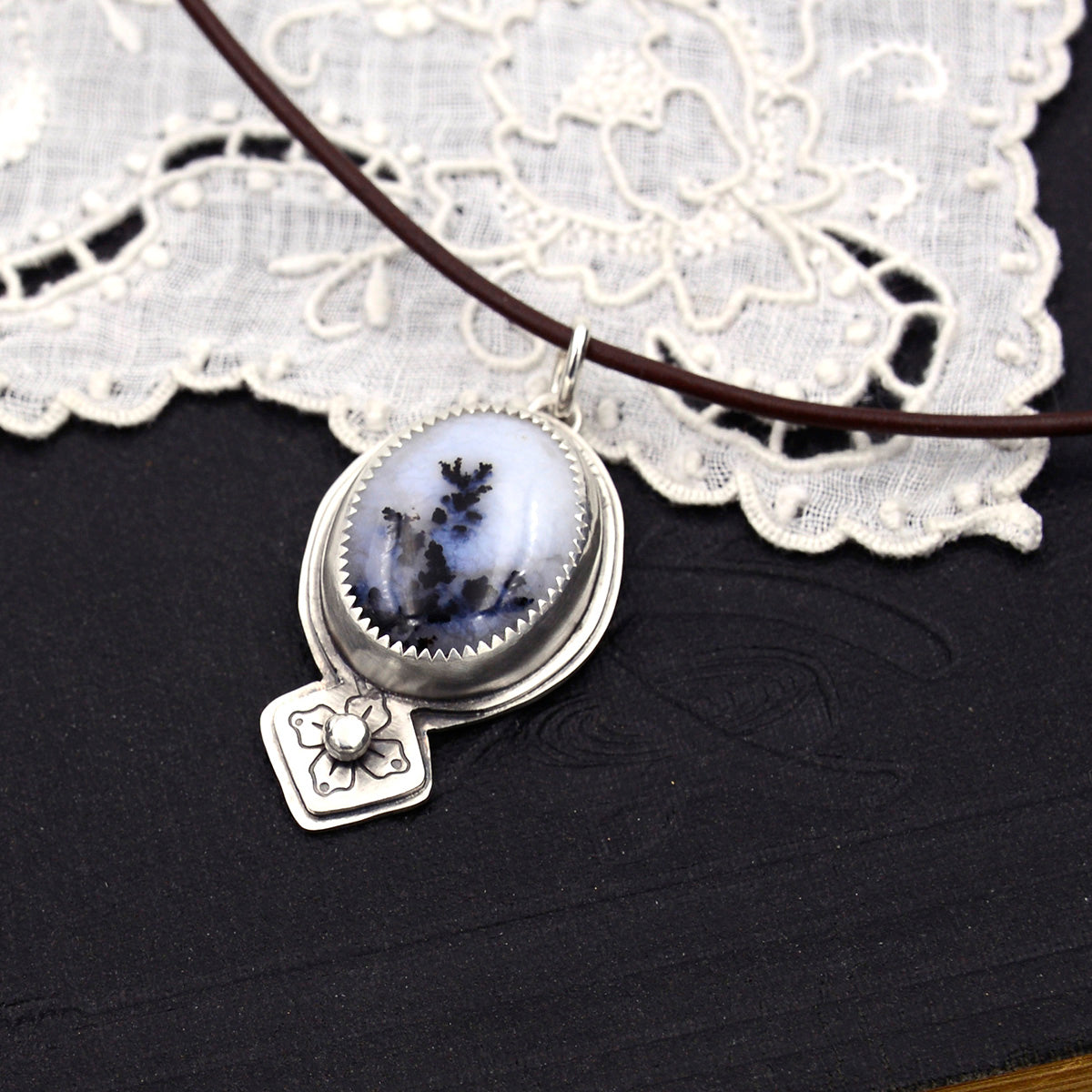 Like a little marker to remind you to stay on the path. This sterling silver Trail Blaze pendant features a stunning black and white dendritic agate.
