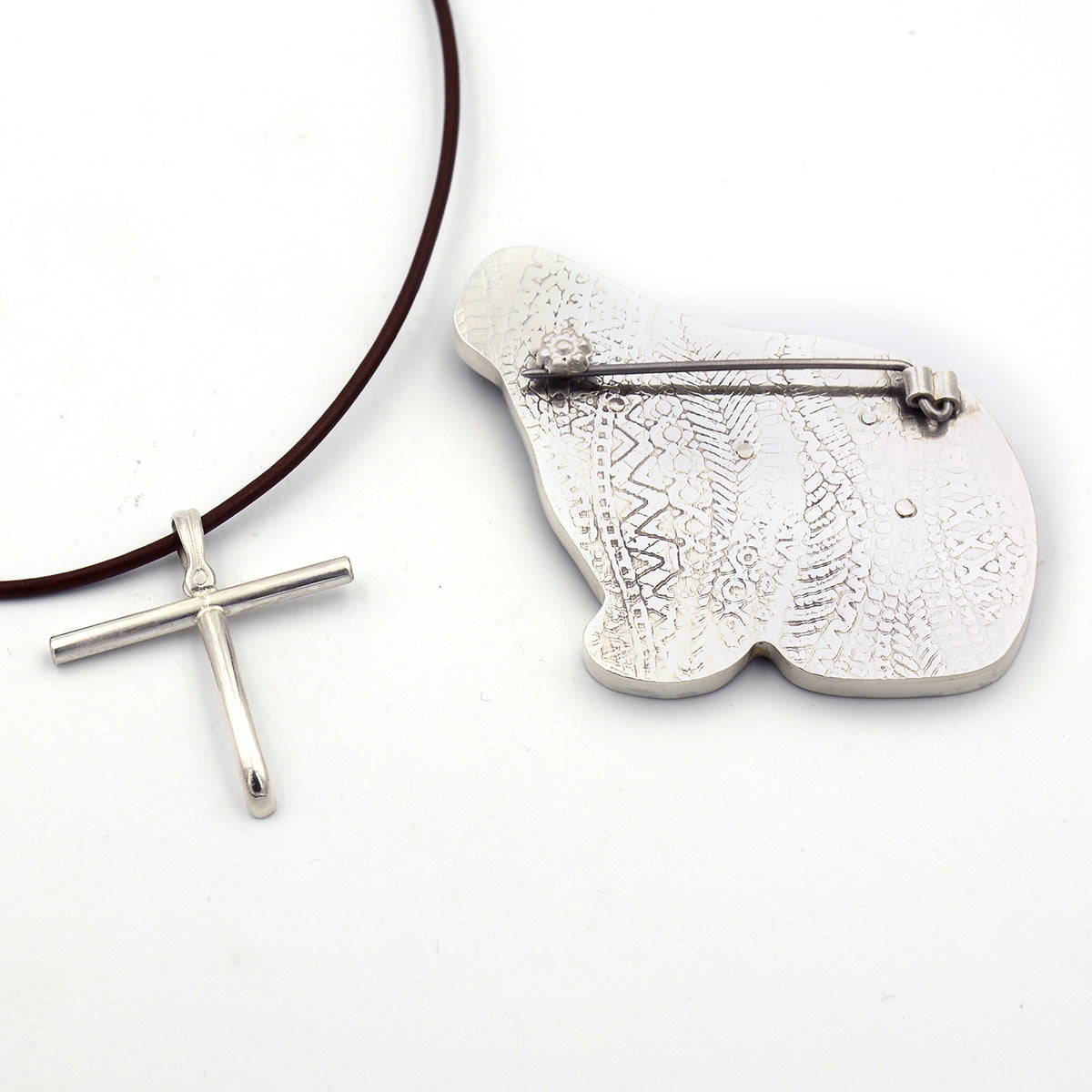 - A custom brooch to pendant converter was made for this piece in sterling silver.