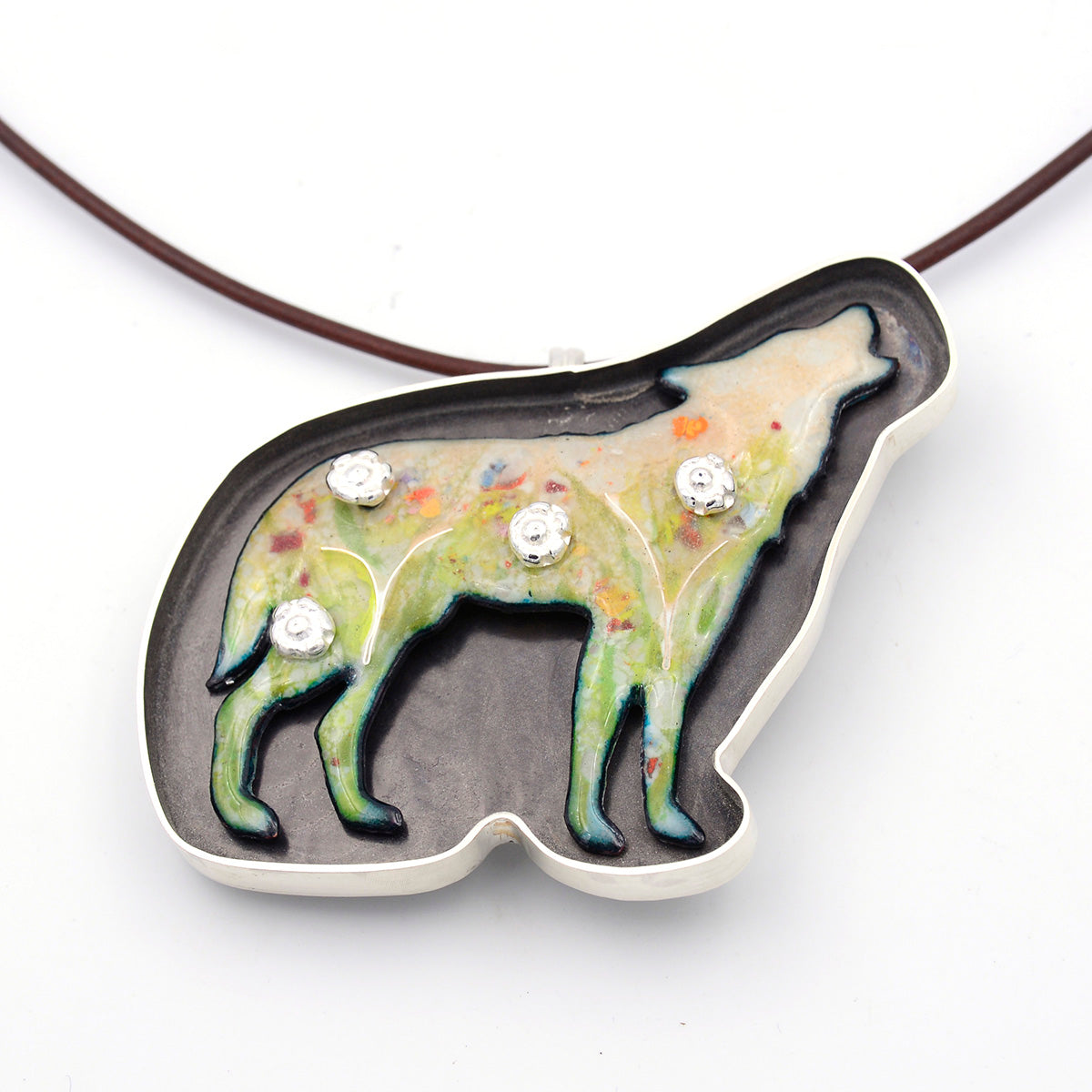 - The wolf is hand sawn, then fourteen layers of glass enamel and fine silver wires are fused onto copper in a kiln.